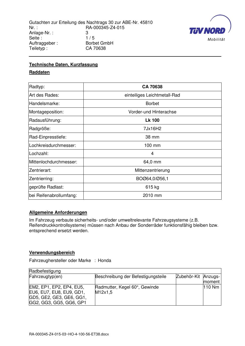 Dieses Gutachten (abe) bezieht sich auf die Alufelge Borbet CA 70638 in der Ausführung 7Jx16 ET 0, Mittenloch 0 mm (KBA 45810). Im PDF findest du typischerweise zulässige Reifengrößen, Auflagen/Anbauhinweise und – je nach Dokument – Hinweise zur Eintragung.