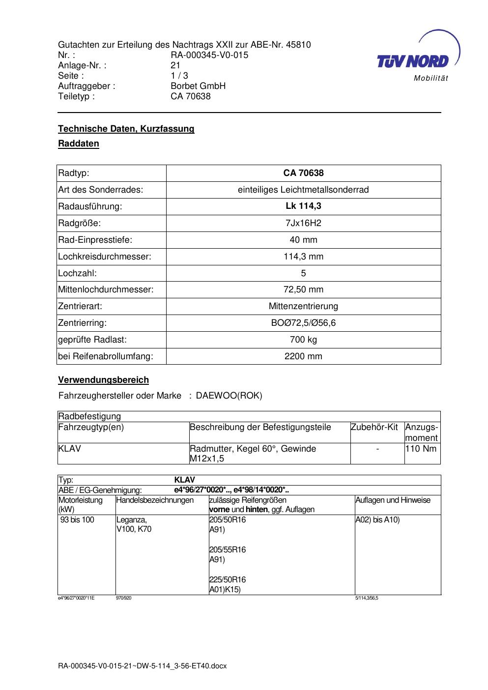 Dieses Gutachten (abe) bezieht sich auf die Alufelge Borbet CA 70638 in der Ausführung 7Jx16 ET 0, Mittenloch 0 mm (KBA 45810). Im PDF findest du typischerweise zulässige Reifengrößen, Auflagen/Anbauhinweise und – je nach Dokument – Hinweise zur Eintragung.