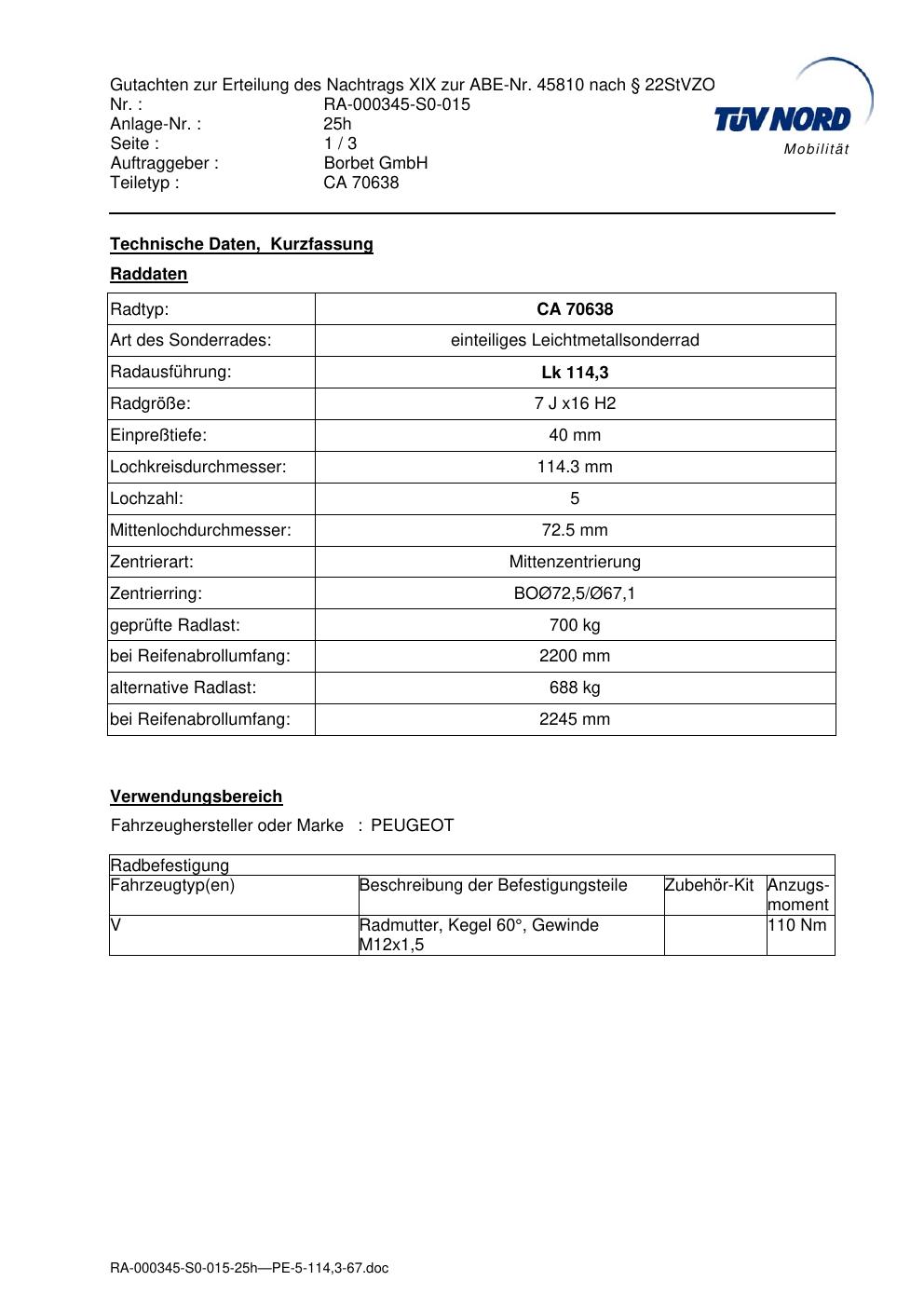 Dieses Gutachten (abe) bezieht sich auf die Alufelge Borbet CA 70638 in der Ausführung 7Jx16 ET 0, Mittenloch 0 mm (KBA 45810). Im PDF findest du typischerweise zulässige Reifengrößen, Auflagen/Anbauhinweise und – je nach Dokument – Hinweise zur Eintragung.