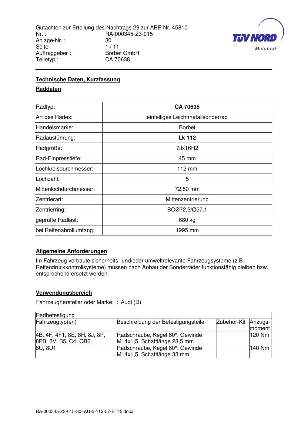 Dieses Gutachten (abe) bezieht sich auf die Alufelge Borbet CA 70638 in der Ausführung 7Jx16 ET 0, Mittenloch 0 mm (KBA 45810). Im PDF findest du typischerweise zulässige Reifengrößen, Auflagen/Anbauhinweise und – je nach Dokument – Hinweise zur Eintragung.