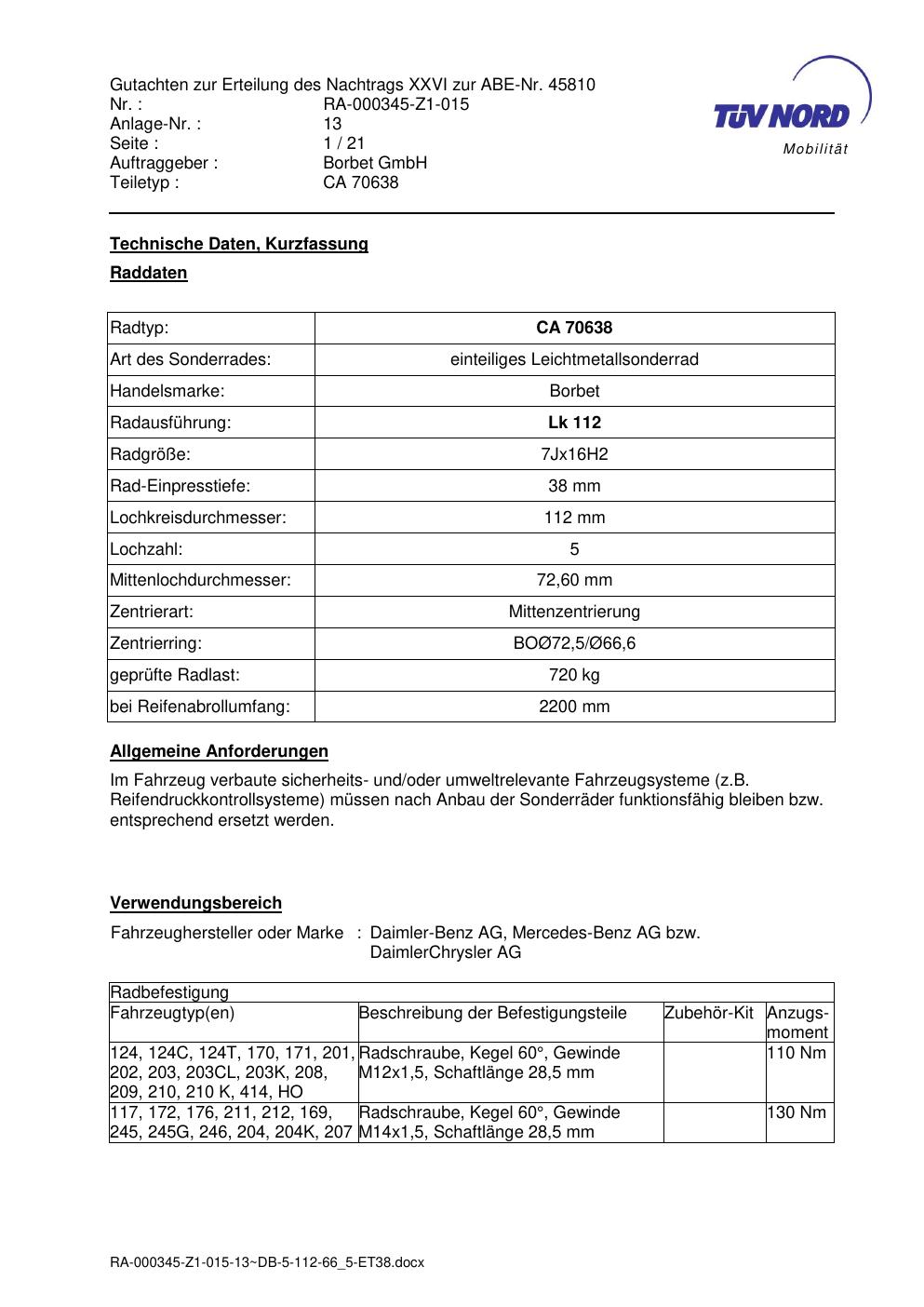 Dieses Gutachten (abe) bezieht sich auf die Alufelge Borbet CA 70638 in der Ausführung 7Jx16 ET 0, Mittenloch 0 mm (KBA 45810). Im PDF findest du typischerweise zulässige Reifengrößen, Auflagen/Anbauhinweise und – je nach Dokument – Hinweise zur Eintragung.