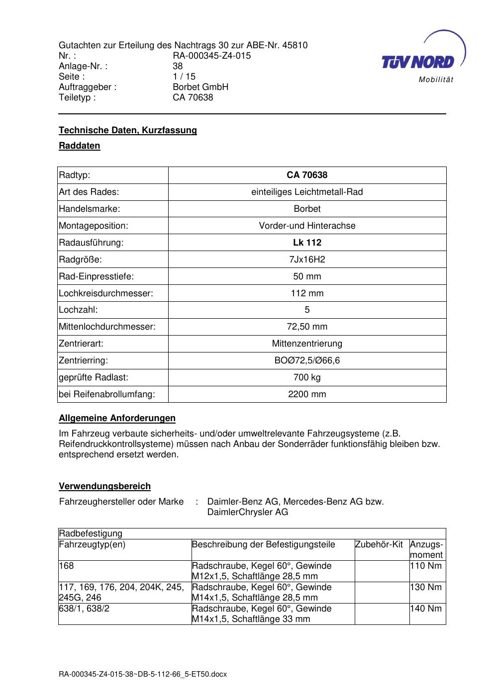 Dieses Gutachten (abe) bezieht sich auf die Alufelge Borbet CA 70638 in der Ausführung 7Jx16 ET 0, Mittenloch 0 mm (KBA 45810). Im PDF findest du typischerweise zulässige Reifengrößen, Auflagen/Anbauhinweise und – je nach Dokument – Hinweise zur Eintragung.