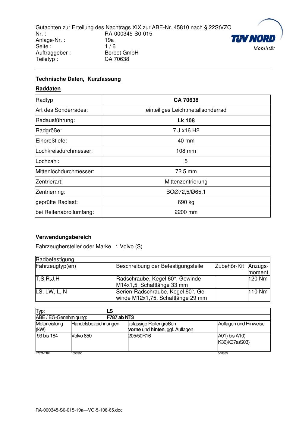 Dieses Gutachten (abe) bezieht sich auf die Alufelge Borbet CA 70638 in der Ausführung 7Jx16 ET 0, Mittenloch 0 mm (KBA 45810). Im PDF findest du typischerweise zulässige Reifengrößen, Auflagen/Anbauhinweise und – je nach Dokument – Hinweise zur Eintragung.