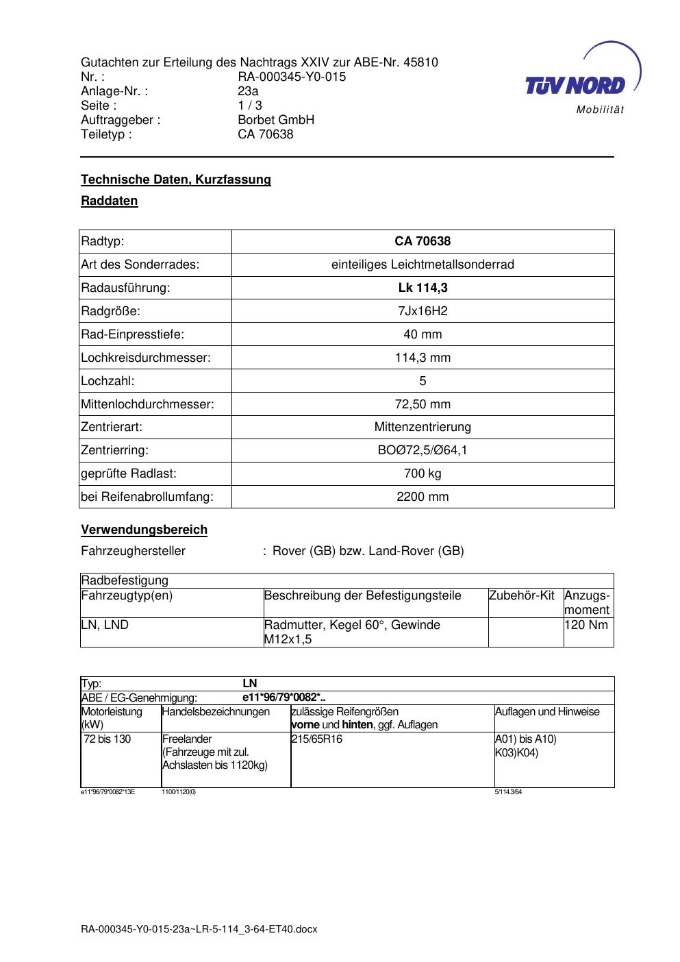 Dieses Gutachten (abe) bezieht sich auf die Alufelge Borbet CA 70638 in der Ausführung 7Jx16 ET 0, Mittenloch 0 mm (KBA 45810). Im PDF findest du typischerweise zulässige Reifengrößen, Auflagen/Anbauhinweise und – je nach Dokument – Hinweise zur Eintragung.