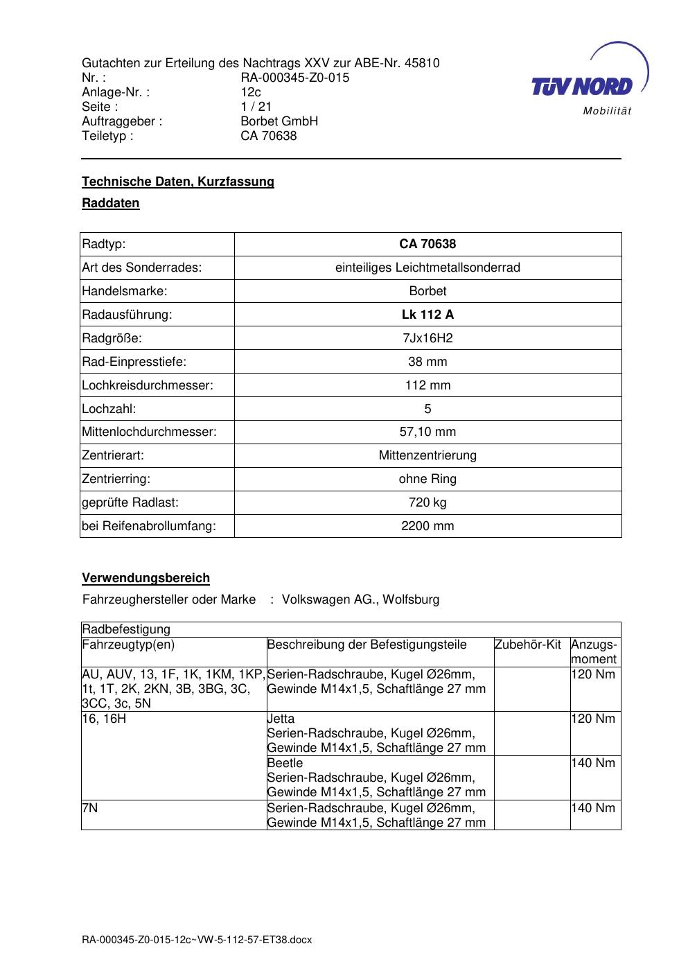 Dieses Gutachten (abe) bezieht sich auf die Alufelge Borbet CA 70638 in der Ausführung 7Jx16 ET 0, Mittenloch 0 mm (KBA 45810). Im PDF findest du typischerweise zulässige Reifengrößen, Auflagen/Anbauhinweise und – je nach Dokument – Hinweise zur Eintragung.