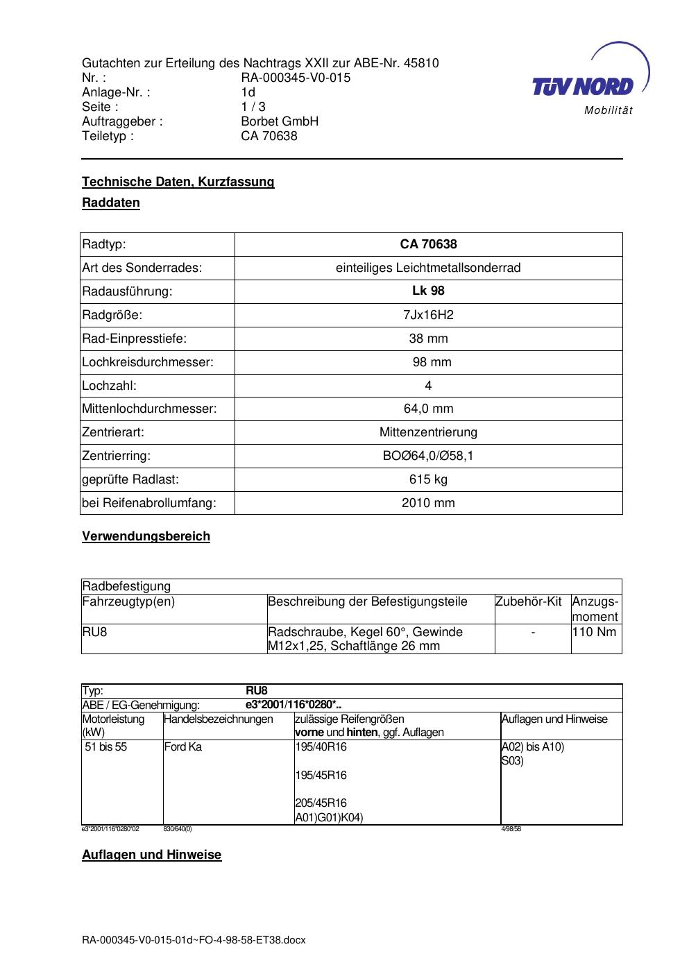 Dieses Gutachten (abe) bezieht sich auf die Alufelge Borbet CA 70638 in der Ausführung 7Jx16 ET 0, Mittenloch 0 mm (KBA 45810). Im PDF findest du typischerweise zulässige Reifengrößen, Auflagen/Anbauhinweise und – je nach Dokument – Hinweise zur Eintragung.