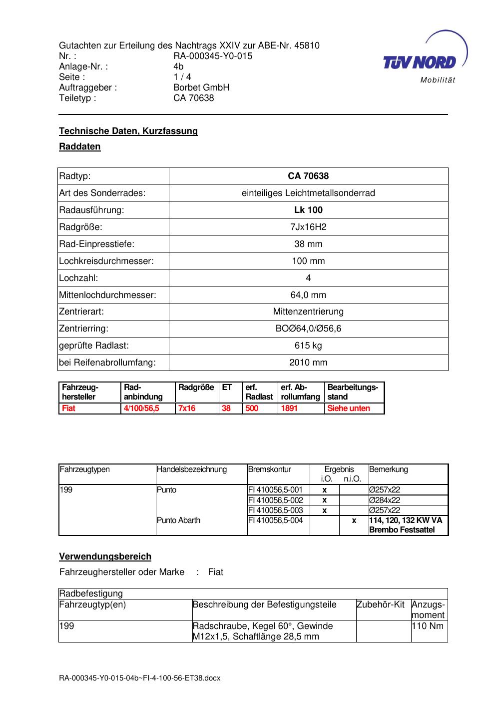 Dieses Gutachten (abe) bezieht sich auf die Alufelge Borbet CA 70638 in der Ausführung 7Jx16 ET 0, Mittenloch 0 mm (KBA 45810). Im PDF findest du typischerweise zulässige Reifengrößen, Auflagen/Anbauhinweise und – je nach Dokument – Hinweise zur Eintragung.