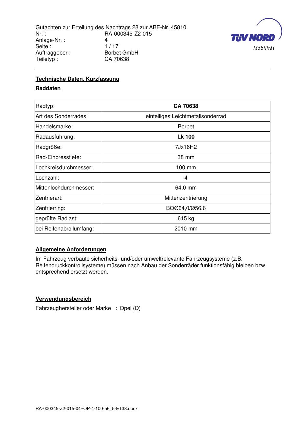 Dieses Gutachten (abe) bezieht sich auf die Alufelge Borbet CA 70638 in der Ausführung 7Jx16 ET 0, Mittenloch 0 mm (KBA 45810). Im PDF findest du typischerweise zulässige Reifengrößen, Auflagen/Anbauhinweise und – je nach Dokument – Hinweise zur Eintragung.