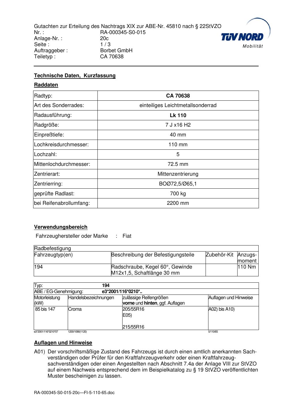 Dieses Gutachten (abe) bezieht sich auf die Alufelge Borbet CA 70638 in der Ausführung 7Jx16 ET 0, Mittenloch 0 mm (KBA 45810). Im PDF findest du typischerweise zulässige Reifengrößen, Auflagen/Anbauhinweise und – je nach Dokument – Hinweise zur Eintragung.