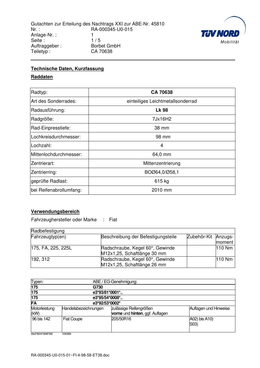 Dieses Gutachten (abe) bezieht sich auf die Alufelge Borbet CA 70638 in der Ausführung 7Jx16 ET 0, Mittenloch 0 mm (KBA 45810). Im PDF findest du typischerweise zulässige Reifengrößen, Auflagen/Anbauhinweise und – je nach Dokument – Hinweise zur Eintragung.