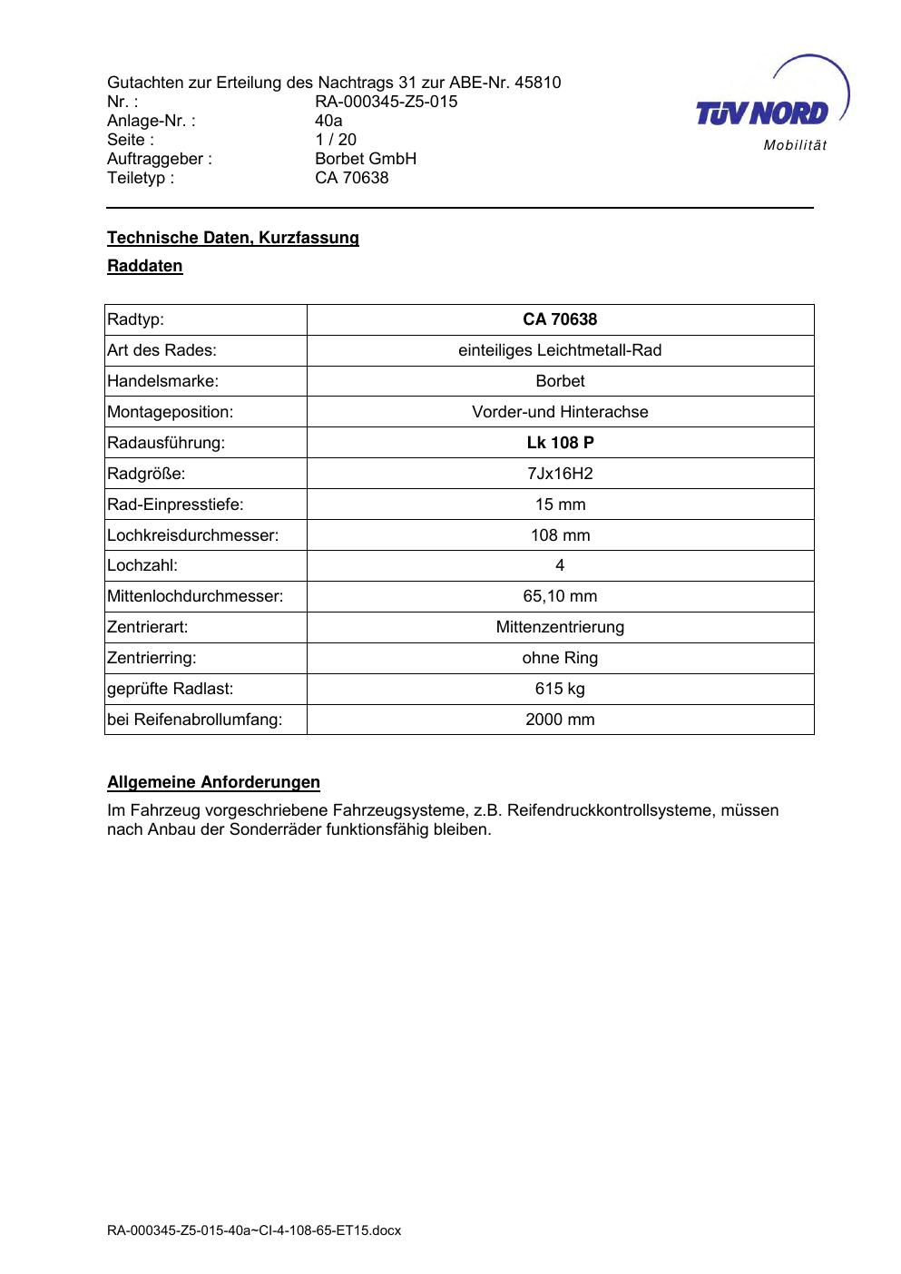 Dieses Gutachten (abe) bezieht sich auf die Alufelge Borbet CA 70638 in der Ausführung 7Jx16 ET 0, Mittenloch 0 mm (KBA 45810). Im PDF findest du typischerweise zulässige Reifengrößen, Auflagen/Anbauhinweise und – je nach Dokument – Hinweise zur Eintragung.