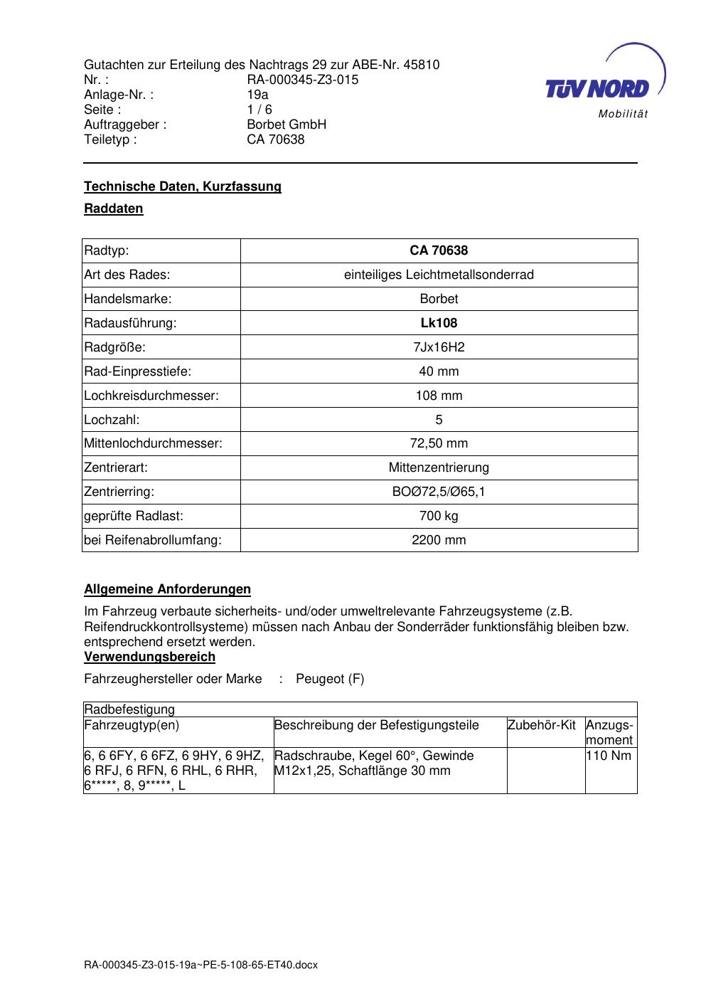 Dieses Gutachten (abe) bezieht sich auf die Alufelge brand-borbet CA 70638 in der Ausführung 7Jx16 ET 0, Mittenloch 0 mm (KBA 45810). Im PDF findest du typischerweise zulässige Reifengrößen, Auflagen/Anbauhinweise und – je nach Dokument – Hinweise zur Eintragung.