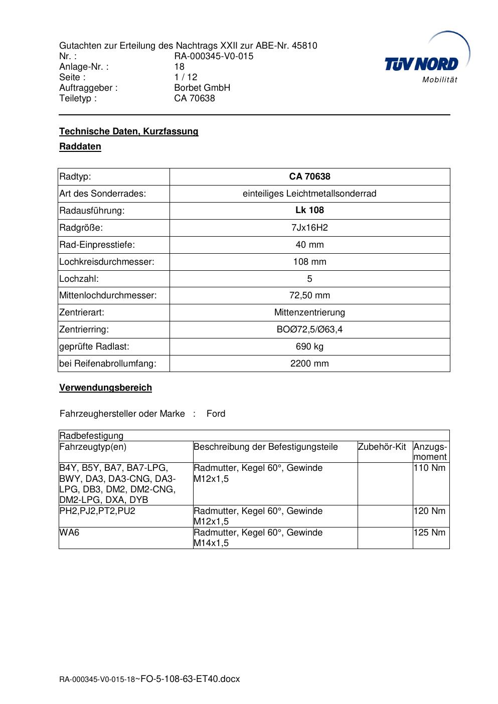 Dieses Gutachten (abe) bezieht sich auf die Alufelge Borbet CA 70638 in der Ausführung 7Jx16 ET 0, Mittenloch 0 mm (KBA 45810). Im PDF findest du typischerweise zulässige Reifengrößen, Auflagen/Anbauhinweise und – je nach Dokument – Hinweise zur Eintragung.