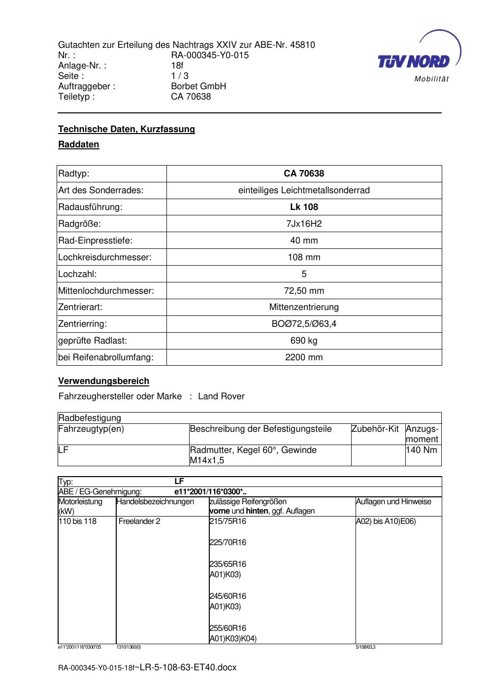 Dieses Gutachten (abe) bezieht sich auf die Alufelge Borbet CA 70638 in der Ausführung 7Jx16 ET 0, Mittenloch 0 mm (KBA 45810). Im PDF findest du typischerweise zulässige Reifengrößen, Auflagen/Anbauhinweise und – je nach Dokument – Hinweise zur Eintragung.