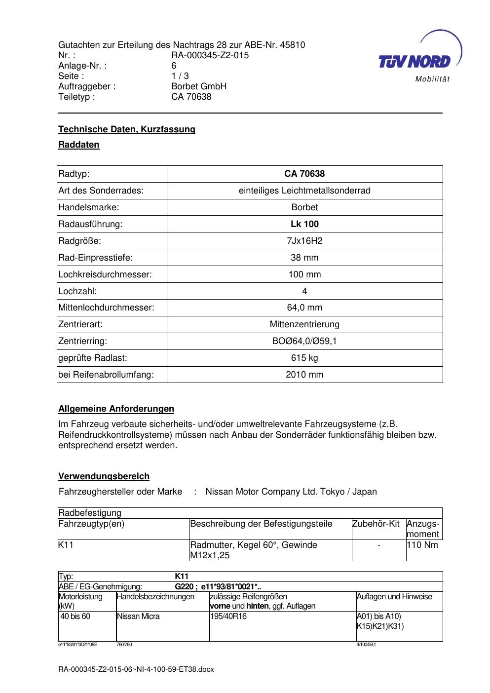 • Stimmt die KBA-Nummer auf der Felge mit diesem Dokument überein?