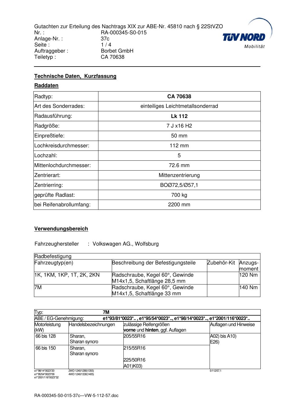 Dieses Gutachten (abe) bezieht sich auf die Alufelge Borbet CA 70638 in der Ausführung 7Jx16 ET 0, Mittenloch 0 mm (KBA 45810). Im PDF findest du typischerweise zulässige Reifengrößen, Auflagen/Anbauhinweise und – je nach Dokument – Hinweise zur Eintragung.