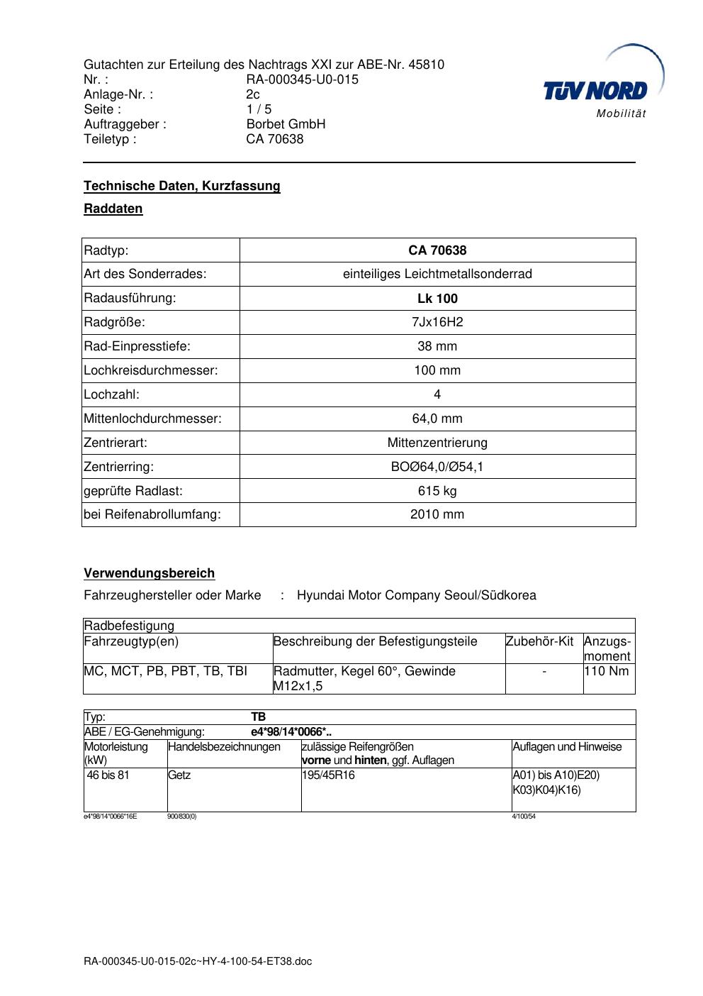 Dieses Gutachten (abe) bezieht sich auf die Alufelge Borbet CA 70638 in der Ausführung 7Jx16 ET 0, Mittenloch 0 mm (KBA 45810). Im PDF findest du typischerweise zulässige Reifengrößen, Auflagen/Anbauhinweise und – je nach Dokument – Hinweise zur Eintragung.