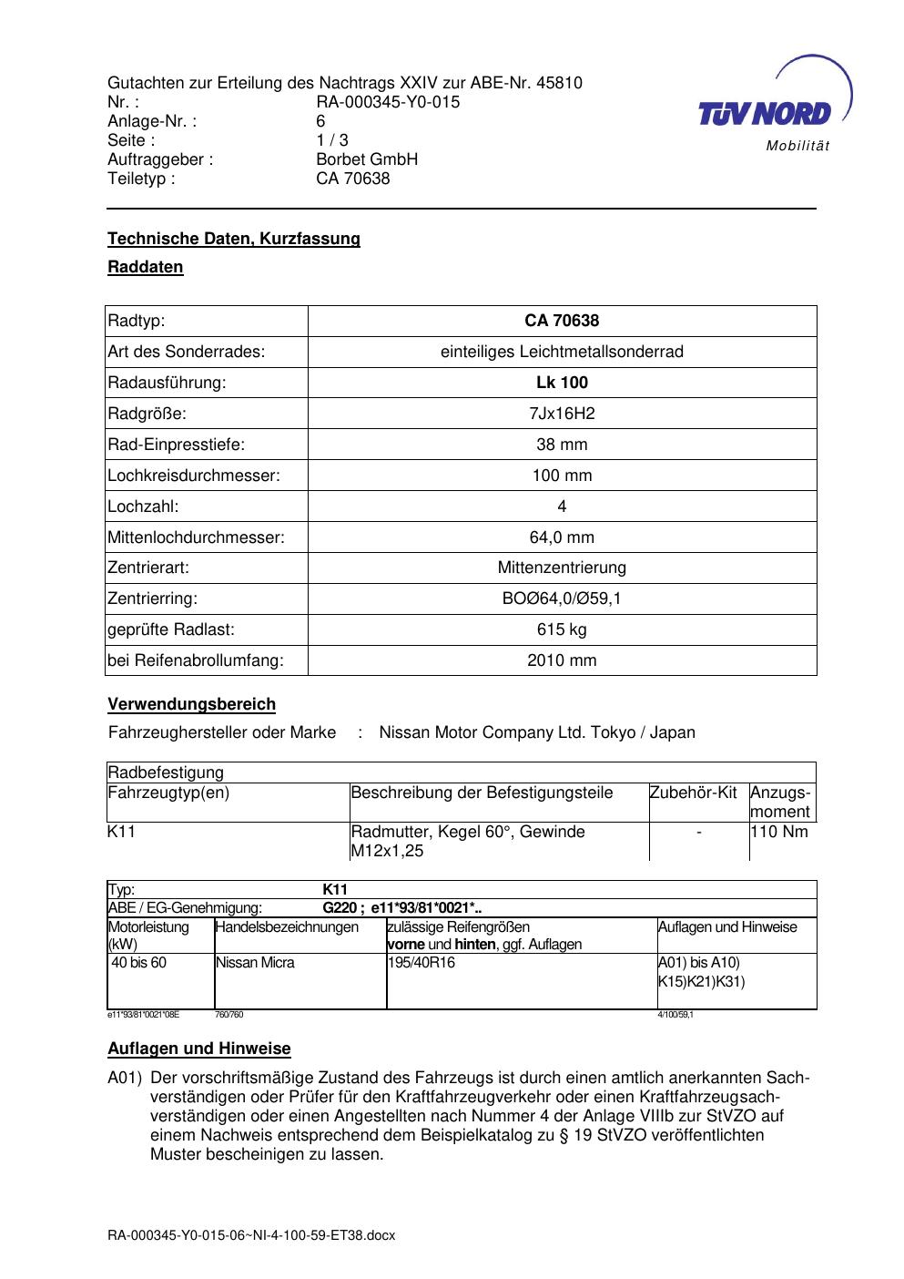 Dieses Gutachten (abe) bezieht sich auf die Alufelge Borbet CA 70638 in der Ausführung 7Jx16 ET 0, Mittenloch 0 mm (KBA 45810). Im PDF findest du typischerweise zulässige Reifengrößen, Auflagen/Anbauhinweise und – je nach Dokument – Hinweise zur Eintragung.
