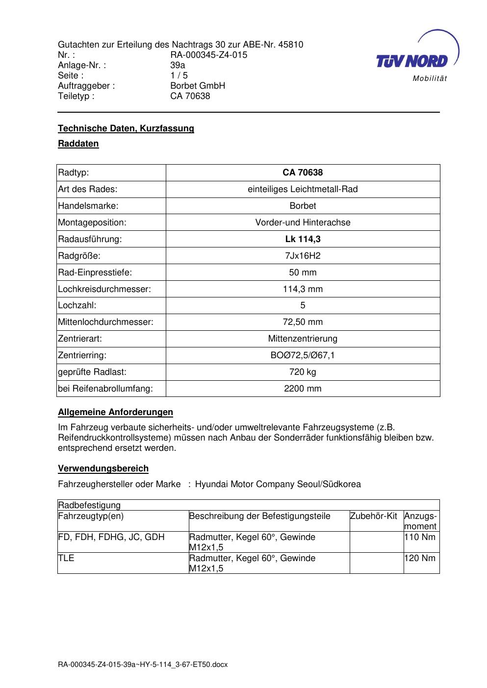 Dieses Gutachten (abe) bezieht sich auf die Alufelge Borbet CA 70638 in der Ausführung 7Jx16 ET 0, Mittenloch 0 mm (KBA 45810). Im PDF findest du typischerweise zulässige Reifengrößen, Auflagen/Anbauhinweise und – je nach Dokument – Hinweise zur Eintragung.