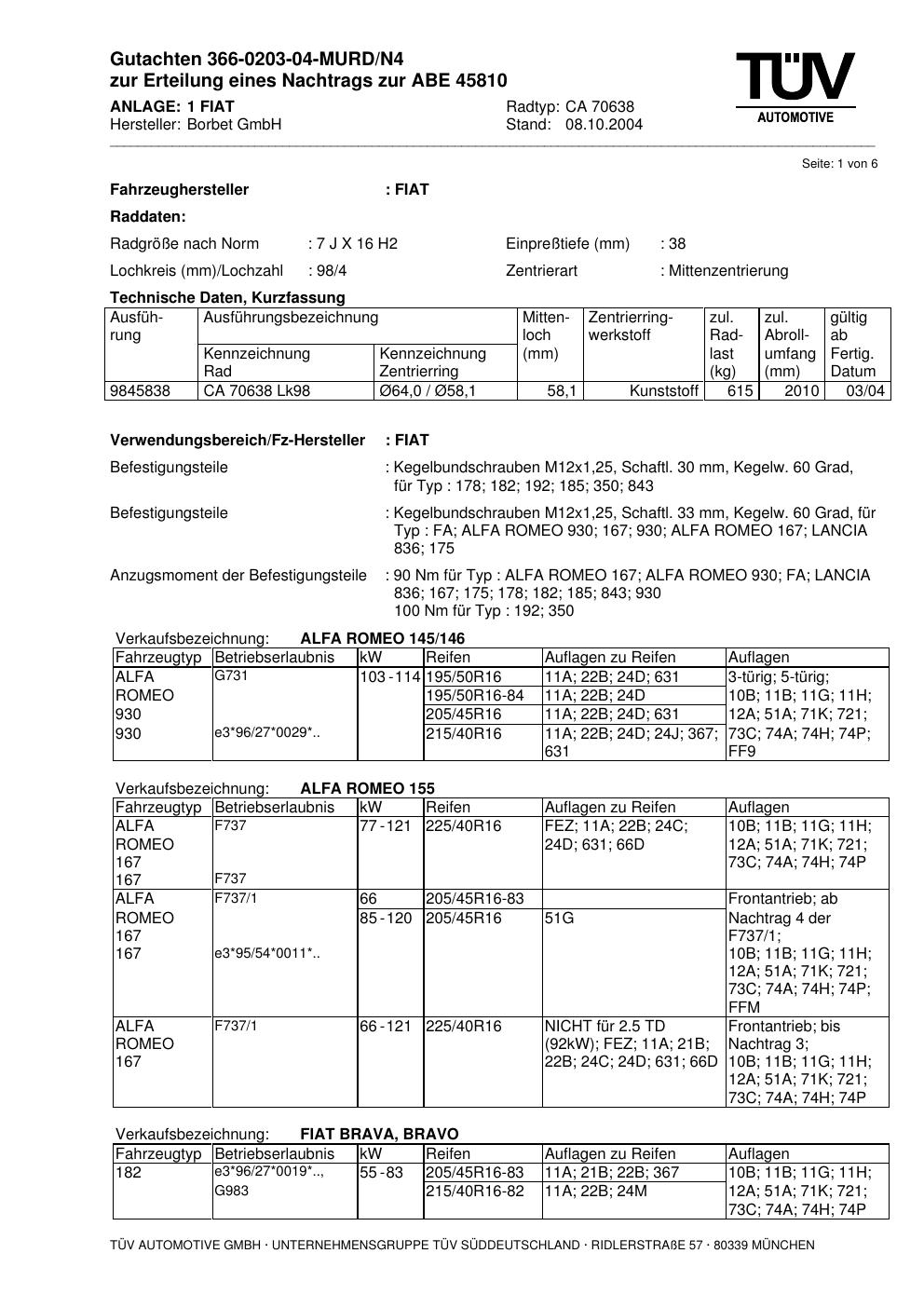 Dieses Gutachten (abe) bezieht sich auf die Alufelge Borbet CA 70638 in der Ausführung 7Jx16 ET 0, Mittenloch 0 mm (KBA 45810). Im PDF findest du typischerweise zulässige Reifengrößen, Auflagen/Anbauhinweise und – je nach Dokument – Hinweise zur Eintragung.