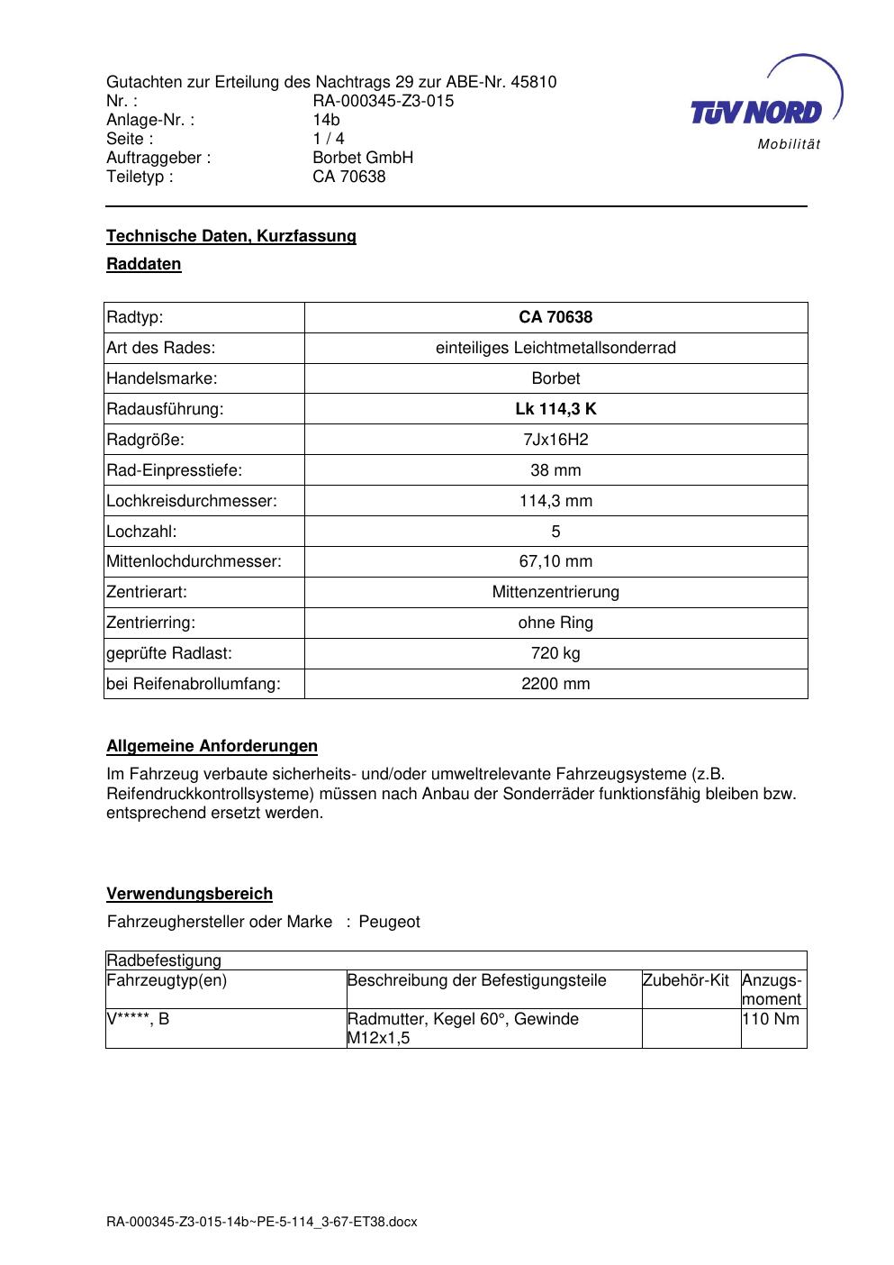 Dieses Gutachten (abe) bezieht sich auf die Alufelge Borbet CA 70638 in der Ausführung 7Jx16 ET 0, Mittenloch 0 mm (KBA 45810). Im PDF findest du typischerweise zulässige Reifengrößen, Auflagen/Anbauhinweise und – je nach Dokument – Hinweise zur Eintragung.