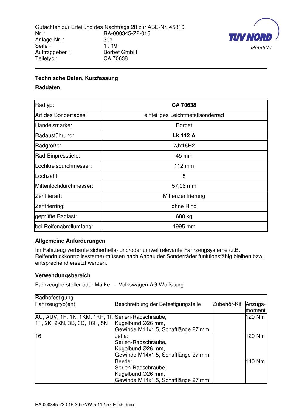 • Stimmt die KBA-Nummer auf der Felge mit diesem Dokument überein?