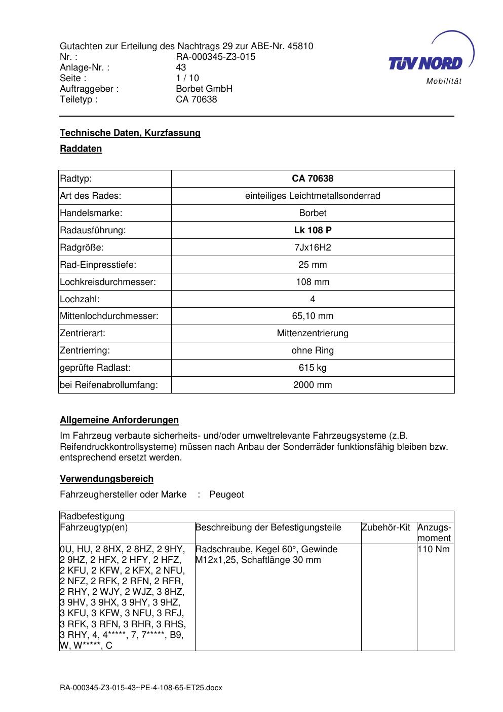 Dieses Gutachten (abe) bezieht sich auf die Alufelge Borbet CA 70638 in der Ausführung 7Jx16 ET 0, Mittenloch 0 mm (KBA 45810). Im PDF findest du typischerweise zulässige Reifengrößen, Auflagen/Anbauhinweise und – je nach Dokument – Hinweise zur Eintragung.