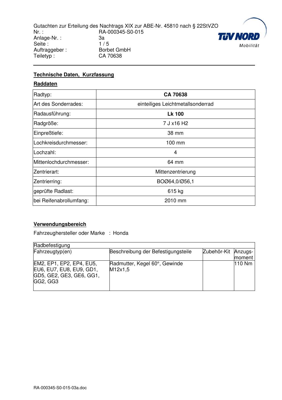Dieses Gutachten (abe) bezieht sich auf die Alufelge Borbet CA 70638 in der Ausführung 7Jx16 ET 0, Mittenloch 0 mm (KBA 45810). Im PDF findest du typischerweise zulässige Reifengrößen, Auflagen/Anbauhinweise und – je nach Dokument – Hinweise zur Eintragung.