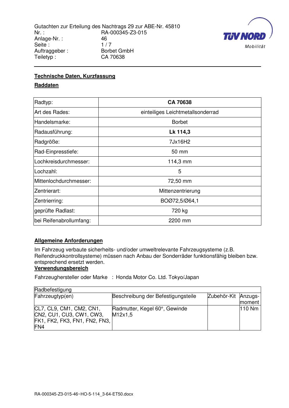 • Stimmt die KBA-Nummer auf der Felge mit diesem Dokument überein?