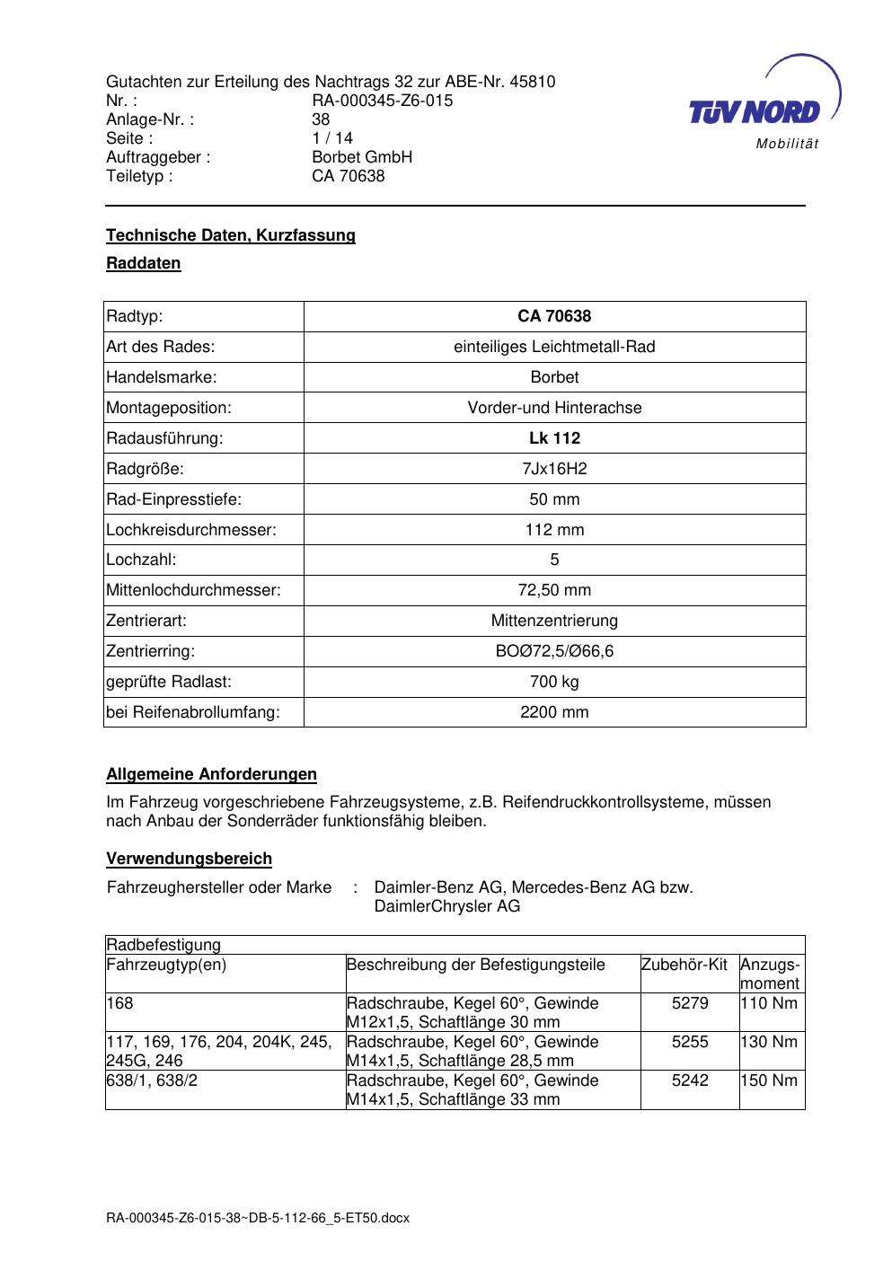 Dieses Gutachten (abe) bezieht sich auf die Alufelge Borbet CA 70638 in der Ausführung 7Jx16 ET 0, Mittenloch 0 mm (KBA 45810). Im PDF findest du typischerweise zulässige Reifengrößen, Auflagen/Anbauhinweise und – je nach Dokument – Hinweise zur Eintragung.