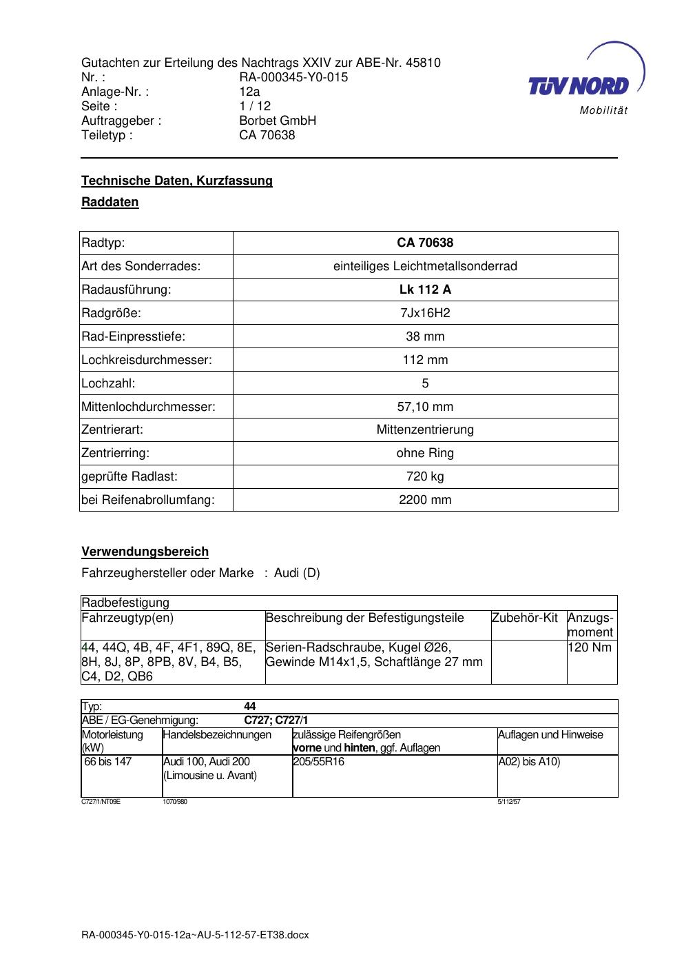 Dieses Gutachten (abe) bezieht sich auf die Alufelge Borbet CA 70638 in der Ausführung 7Jx16 ET 0, Mittenloch 0 mm (KBA 45810). Im PDF findest du typischerweise zulässige Reifengrößen, Auflagen/Anbauhinweise und – je nach Dokument – Hinweise zur Eintragung.