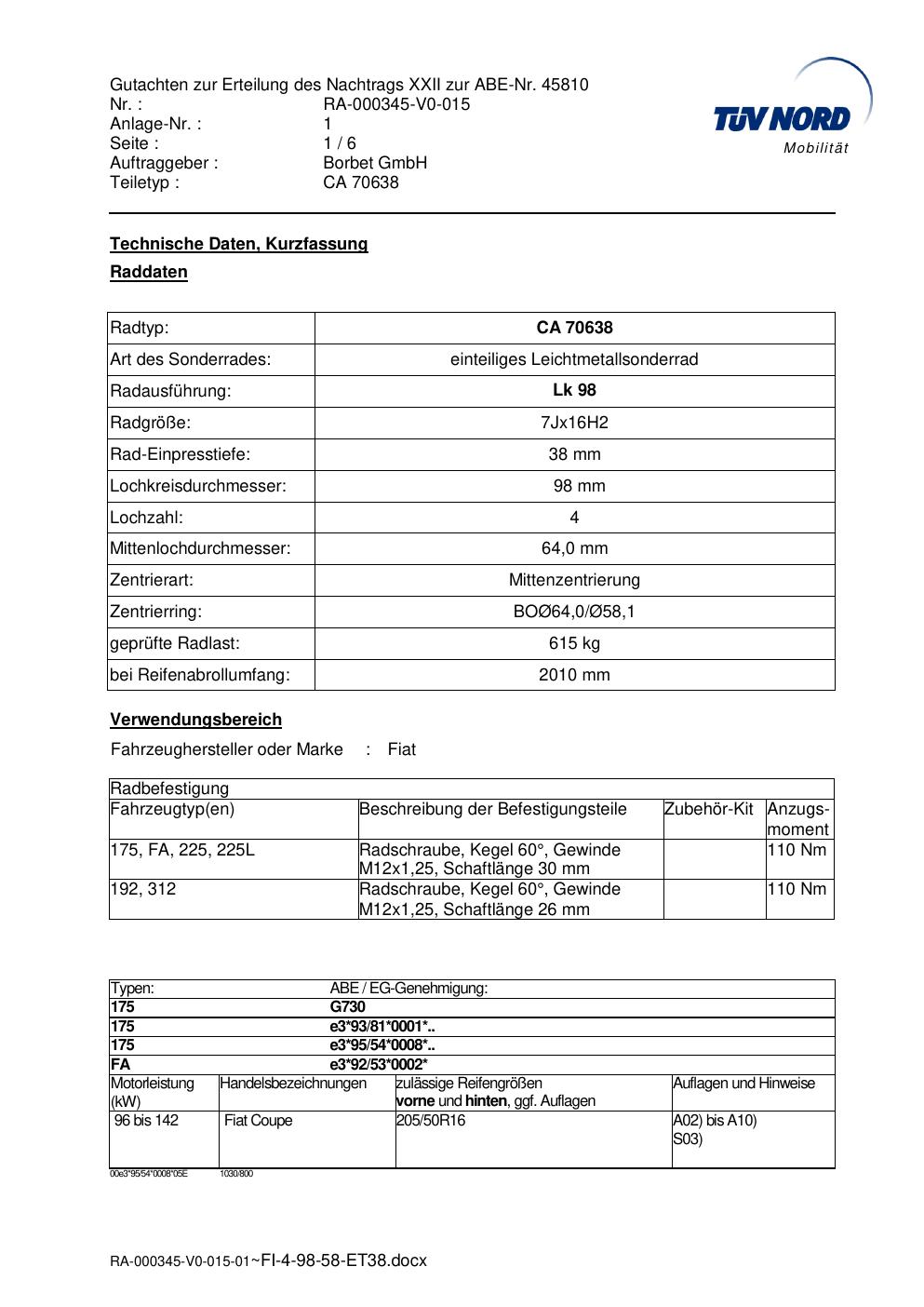 Dieses Gutachten (abe) bezieht sich auf die Alufelge Borbet CA 70638 in der Ausführung 7Jx16 ET 0, Mittenloch 0 mm (KBA 45810). Im PDF findest du typischerweise zulässige Reifengrößen, Auflagen/Anbauhinweise und – je nach Dokument – Hinweise zur Eintragung.
