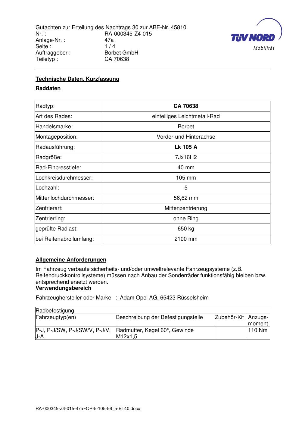 Dieses Gutachten (abe) bezieht sich auf die Alufelge Borbet CA 70638 in der Ausführung 7Jx16 ET 0, Mittenloch 0 mm (KBA 45810). Im PDF findest du typischerweise zulässige Reifengrößen, Auflagen/Anbauhinweise und – je nach Dokument – Hinweise zur Eintragung.