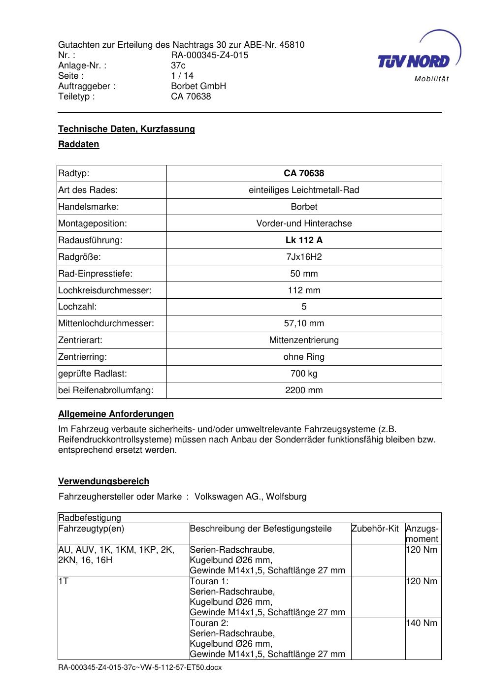 Dieses Gutachten (abe) bezieht sich auf die Alufelge Borbet CA 70638 in der Ausführung 7Jx16 ET 0, Mittenloch 0 mm (KBA 45810). Im PDF findest du typischerweise zulässige Reifengrößen, Auflagen/Anbauhinweise und – je nach Dokument – Hinweise zur Eintragung.