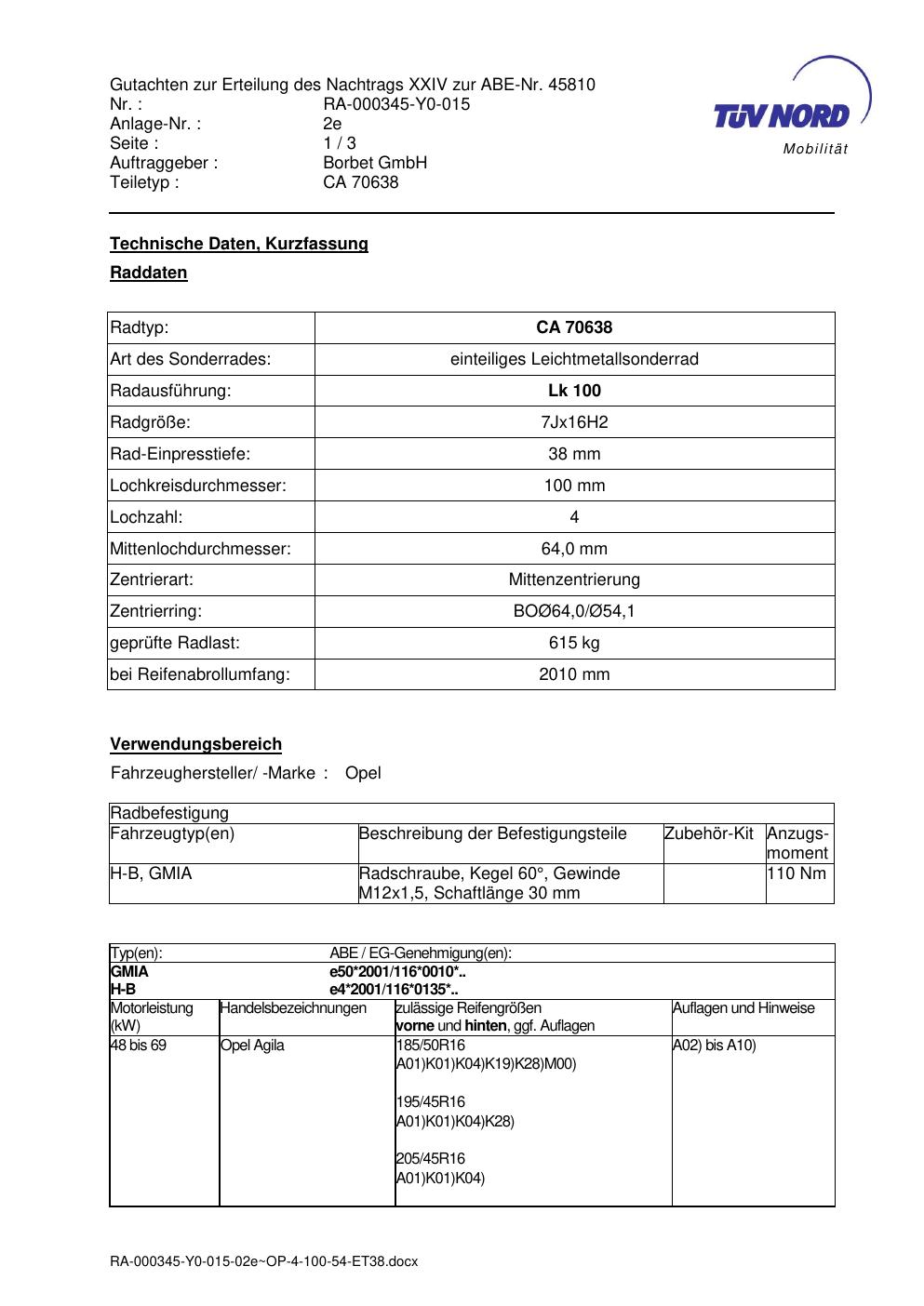 Dieses Gutachten (abe) bezieht sich auf die Alufelge Borbet CA 70638 in der Ausführung 7Jx16 ET 0, Mittenloch 0 mm (KBA 45810). Im PDF findest du typischerweise zulässige Reifengrößen, Auflagen/Anbauhinweise und – je nach Dokument – Hinweise zur Eintragung.