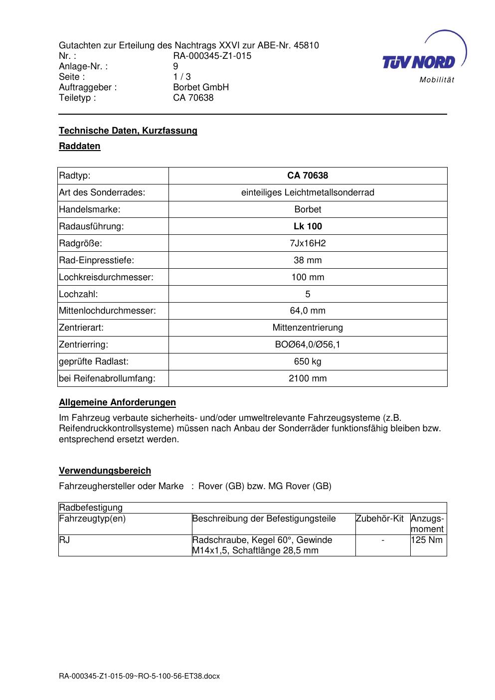 Dieses Gutachten (abe) bezieht sich auf die Alufelge brand-borbet CA 70638 in der Ausführung 7Jx16 ET 0, Mittenloch 0 mm (KBA 45810). Im PDF findest du typischerweise zulässige Reifengrößen, Auflagen/Anbauhinweise und – je nach Dokument – Hinweise zur Eintragung.