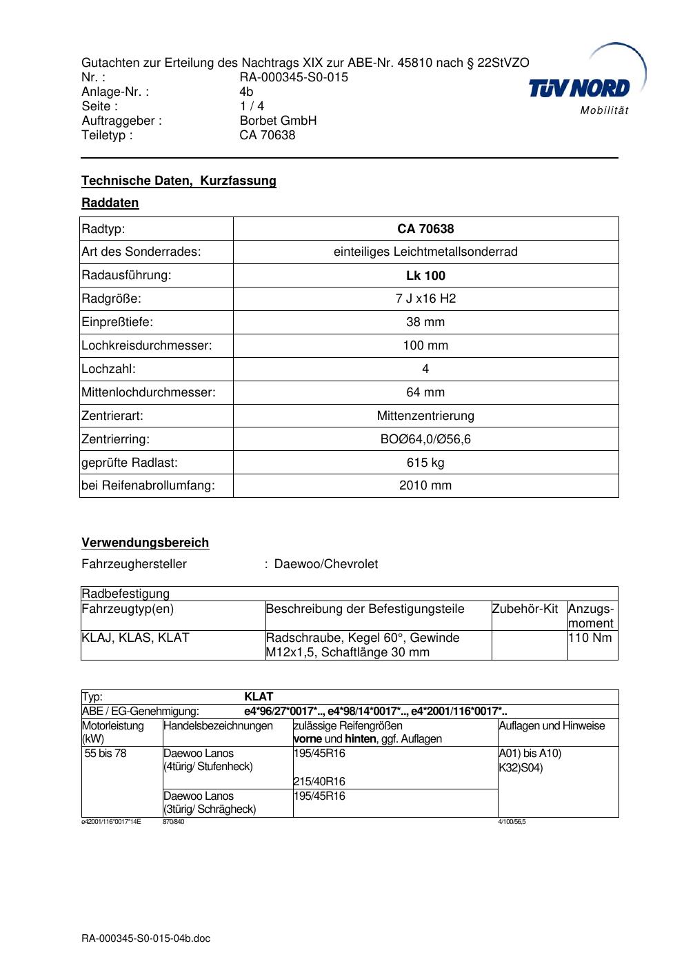 Dieses Gutachten (abe) bezieht sich auf die Alufelge Borbet CA 70638 in der Ausführung 7Jx16 ET 0, Mittenloch 0 mm (KBA 45810). Im PDF findest du typischerweise zulässige Reifengrößen, Auflagen/Anbauhinweise und – je nach Dokument – Hinweise zur Eintragung.