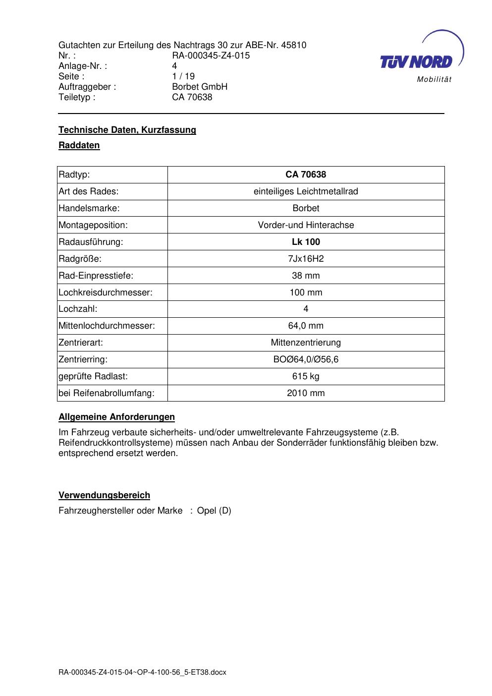 Dieses Gutachten (abe) bezieht sich auf die Alufelge Borbet CA 70638 in der Ausführung 7Jx16 ET 0, Mittenloch 0 mm (KBA 45810). Im PDF findest du typischerweise zulässige Reifengrößen, Auflagen/Anbauhinweise und – je nach Dokument – Hinweise zur Eintragung.