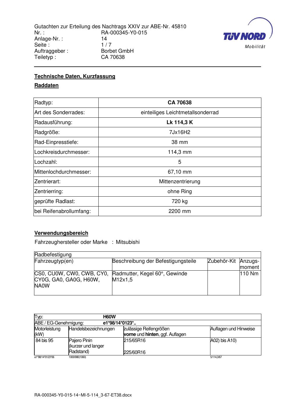 Dieses Gutachten (abe) bezieht sich auf die Alufelge Borbet CA 70638 in der Ausführung 7Jx16 ET 0, Mittenloch 0 mm (KBA 45810). Im PDF findest du typischerweise zulässige Reifengrößen, Auflagen/Anbauhinweise und – je nach Dokument – Hinweise zur Eintragung.