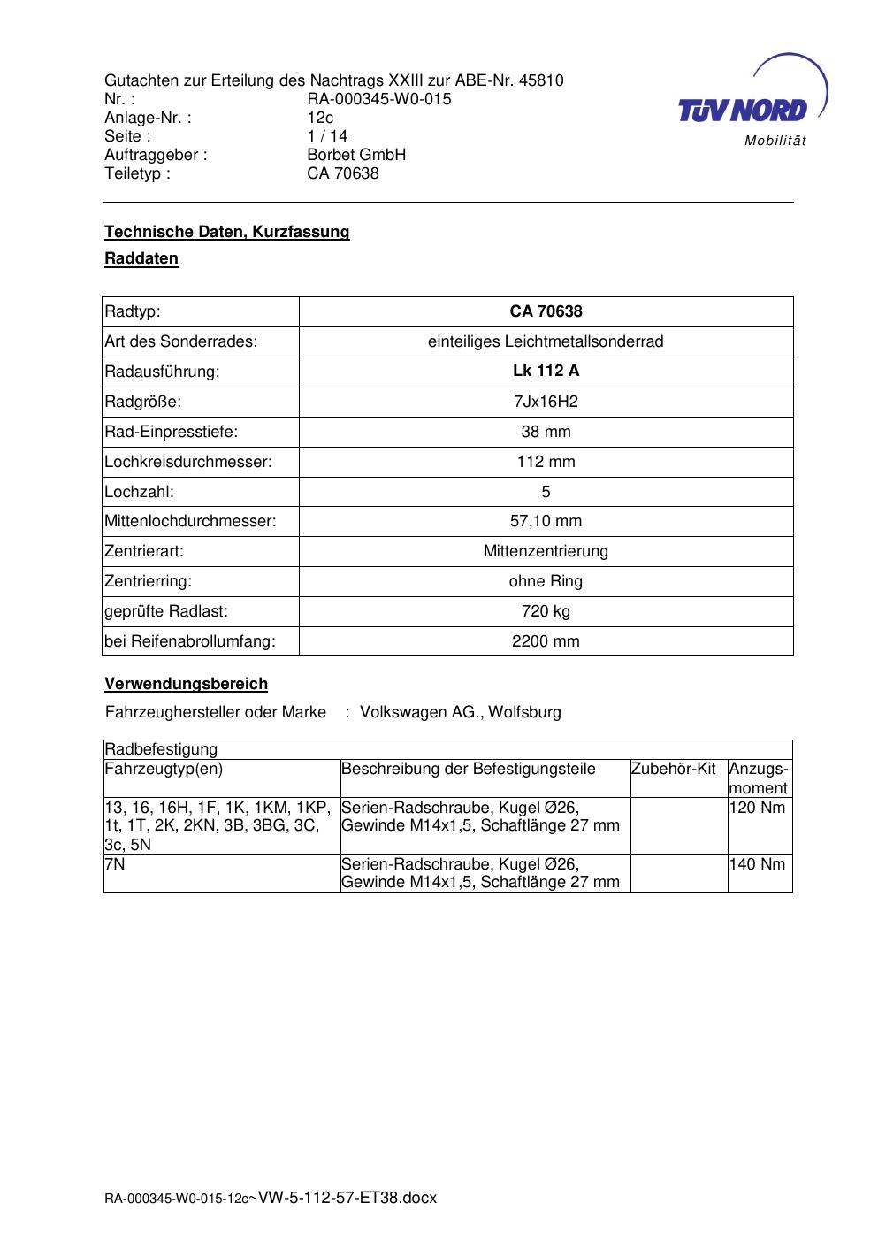 Dieses Gutachten (abe) bezieht sich auf die Alufelge Borbet CA 70638 in der Ausführung 7Jx16 ET 0, Mittenloch 0 mm (KBA 45810). Im PDF findest du typischerweise zulässige Reifengrößen, Auflagen/Anbauhinweise und – je nach Dokument – Hinweise zur Eintragung.