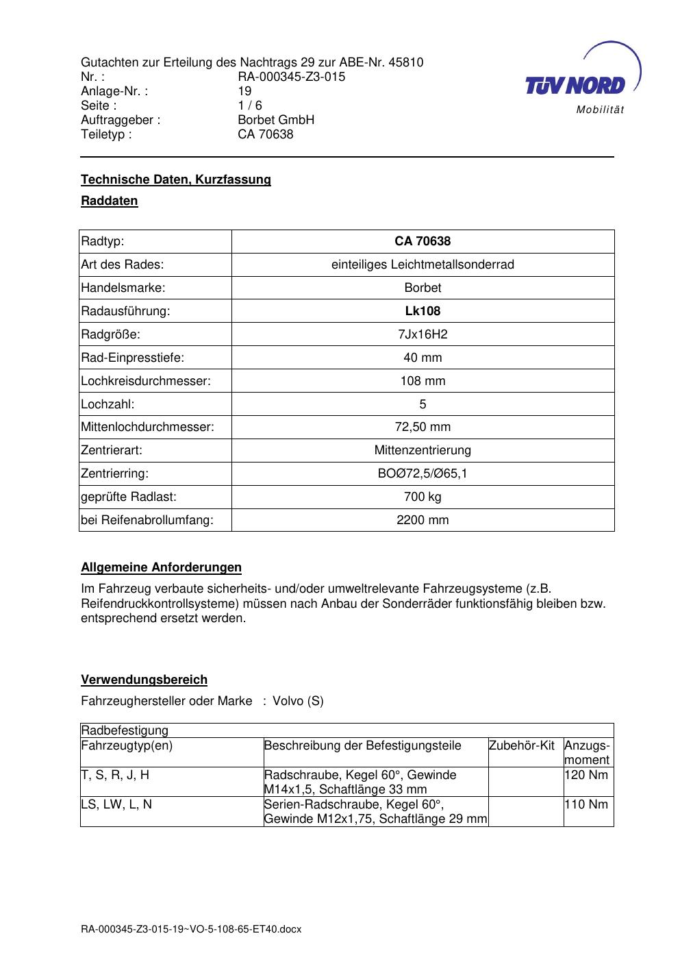 Dieses Gutachten (abe) bezieht sich auf die Alufelge Borbet CA 70638 in der Ausführung 7Jx16 ET 0, Mittenloch 0 mm (KBA 45810). Im PDF findest du typischerweise zulässige Reifengrößen, Auflagen/Anbauhinweise und – je nach Dokument – Hinweise zur Eintragung.