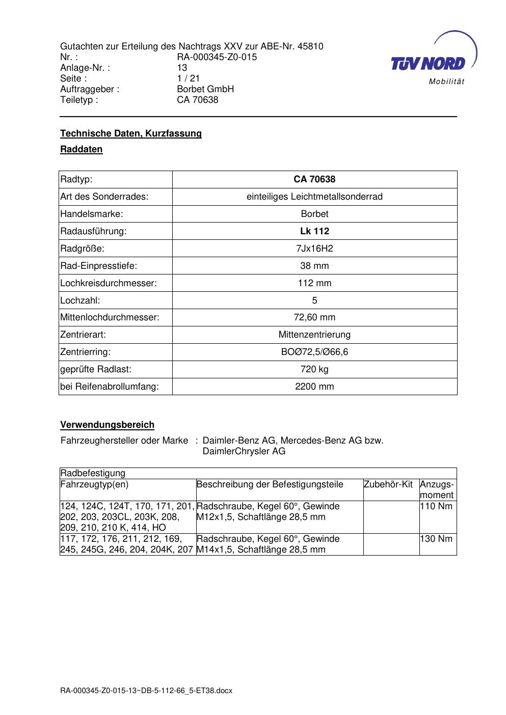 • Stimmt die KBA-Nummer auf der Felge mit diesem Dokument überein?