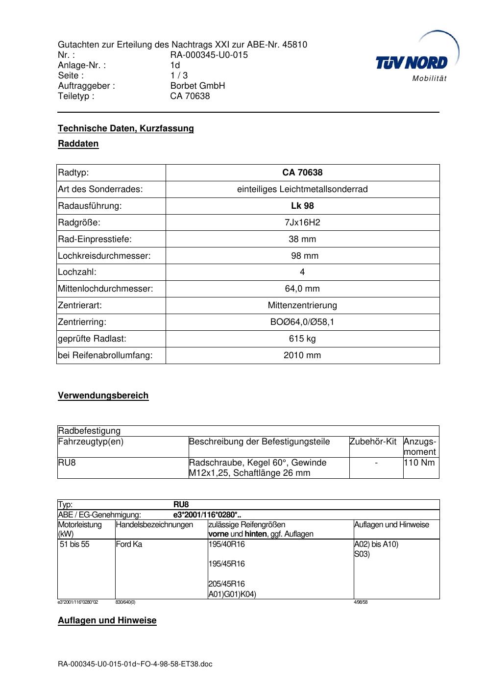 Dieses Gutachten (abe) bezieht sich auf die Alufelge Borbet CA 70638 in der Ausführung 7Jx16 ET 0, Mittenloch 0 mm (KBA 45810). Im PDF findest du typischerweise zulässige Reifengrößen, Auflagen/Anbauhinweise und – je nach Dokument – Hinweise zur Eintragung.