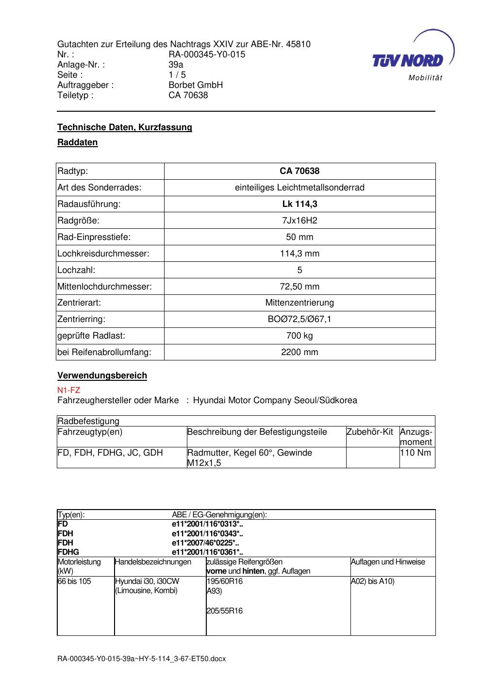 Dieses Gutachten (abe) bezieht sich auf die Alufelge Borbet CA 70638 in der Ausführung 7Jx16 ET 0, Mittenloch 0 mm (KBA 45810). Im PDF findest du typischerweise zulässige Reifengrößen, Auflagen/Anbauhinweise und – je nach Dokument – Hinweise zur Eintragung.