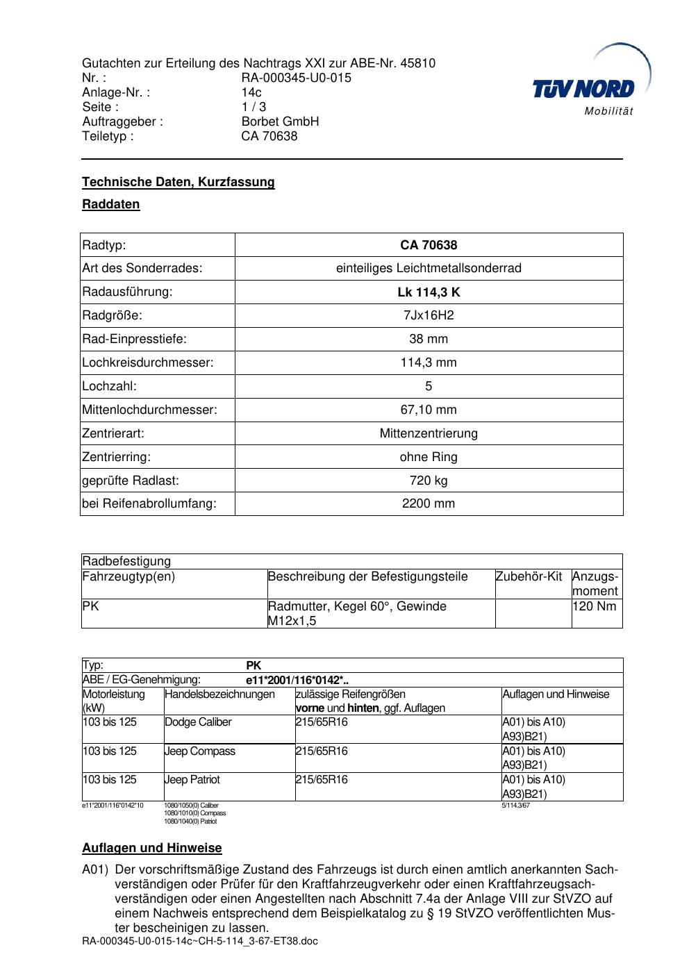 Dieses Gutachten (abe) bezieht sich auf die Alufelge Borbet CA 70638 in der Ausführung 7Jx16 ET 0, Mittenloch 0 mm (KBA 45810). Im PDF findest du typischerweise zulässige Reifengrößen, Auflagen/Anbauhinweise und – je nach Dokument – Hinweise zur Eintragung.