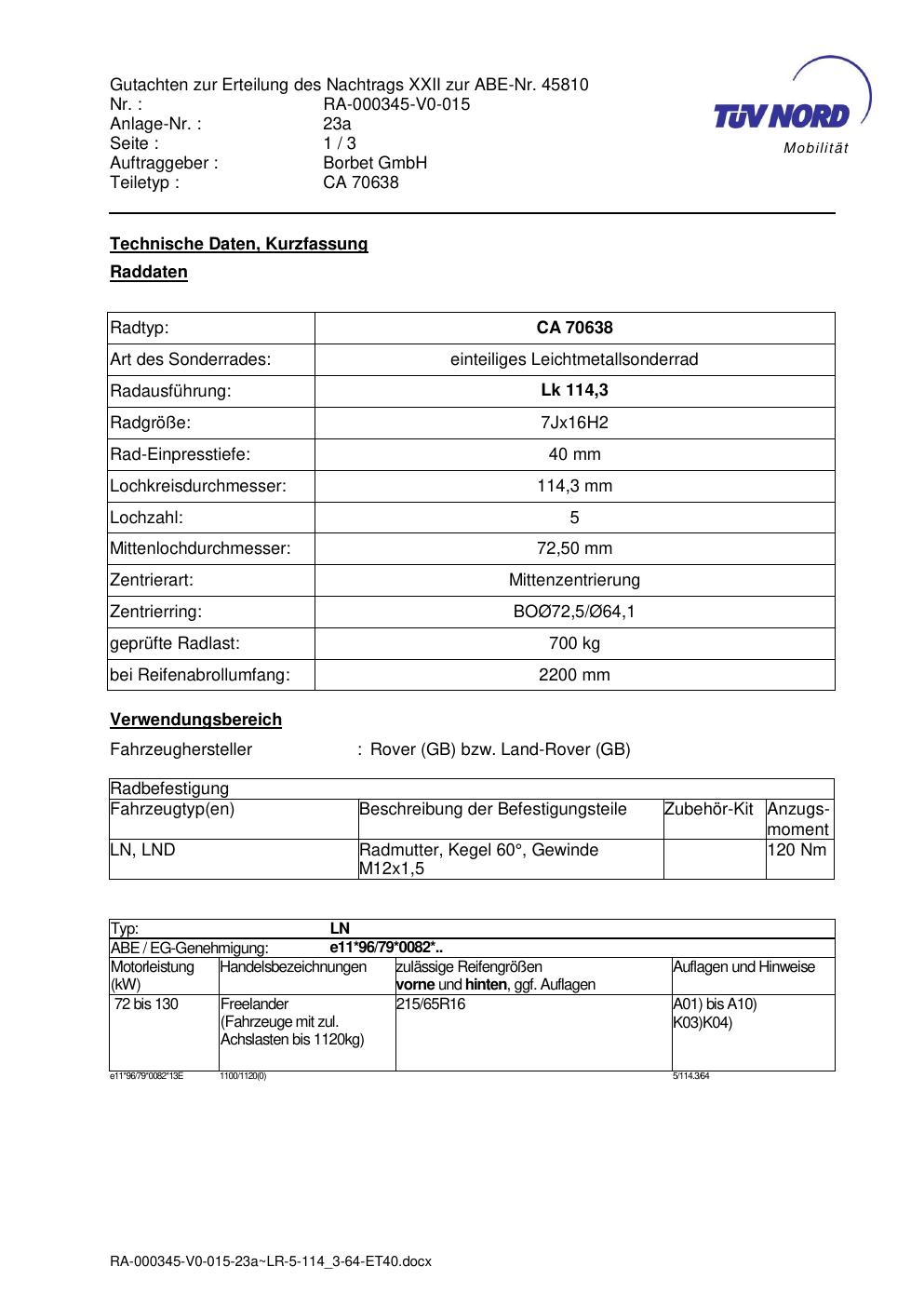 Dieses Gutachten (abe) bezieht sich auf die Alufelge Borbet CA 70638 in der Ausführung 7Jx16 ET 0, Mittenloch 0 mm (KBA 45810). Im PDF findest du typischerweise zulässige Reifengrößen, Auflagen/Anbauhinweise und – je nach Dokument – Hinweise zur Eintragung.