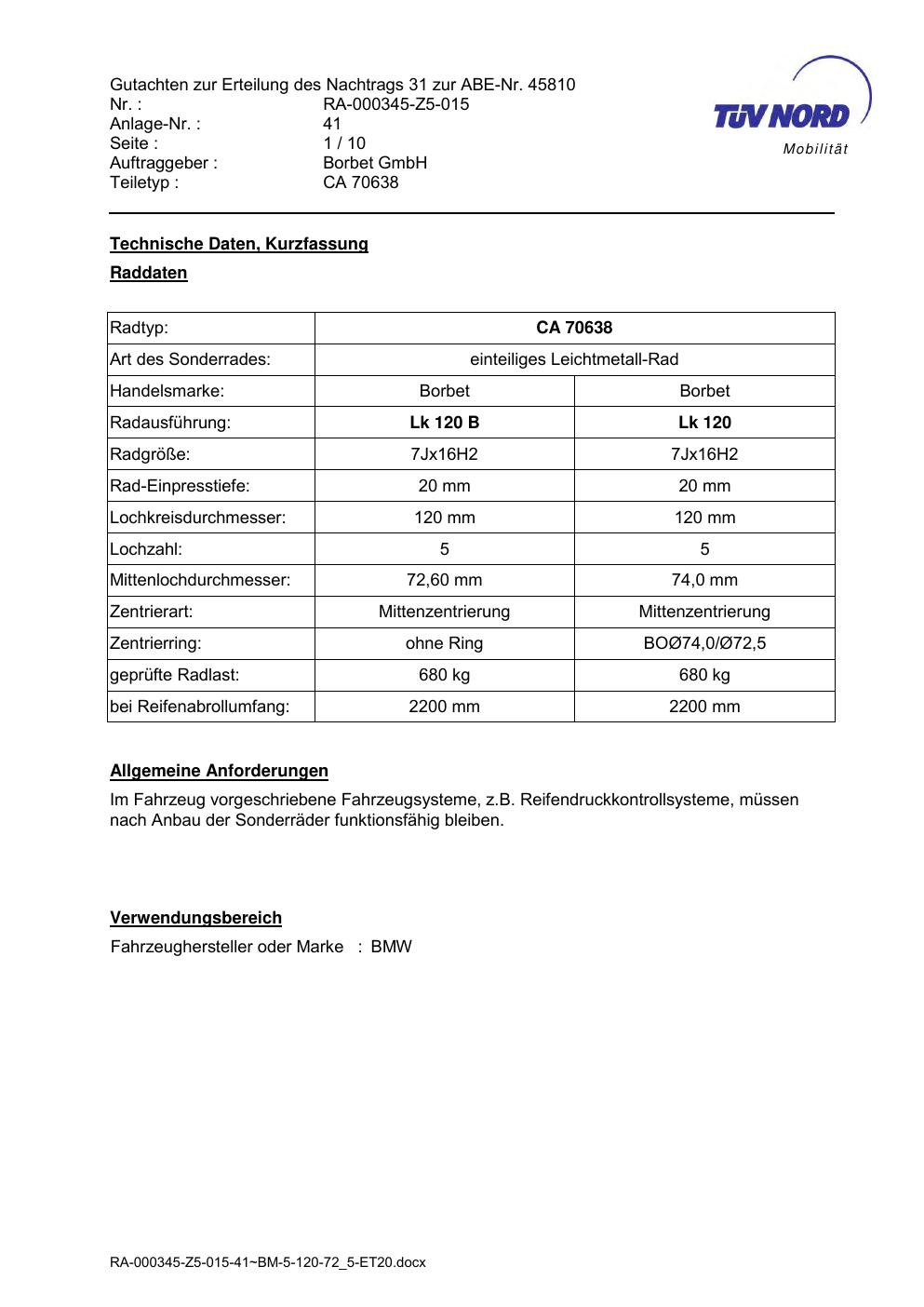 Dieses Gutachten (abe) bezieht sich auf die Alufelge Borbet CA 70638 in der Ausführung 7Jx16 ET 0, Mittenloch 0 mm (KBA 45810). Im PDF findest du typischerweise zulässige Reifengrößen, Auflagen/Anbauhinweise und – je nach Dokument – Hinweise zur Eintragung.