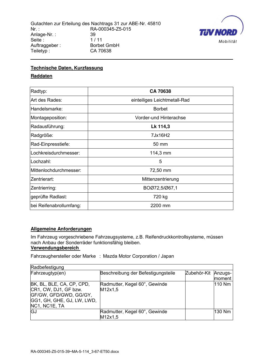 Dieses Gutachten (abe) bezieht sich auf die Alufelge Borbet CA 70638 in der Ausführung 7Jx16 ET 0, Mittenloch 0 mm (KBA 45810). Im PDF findest du typischerweise zulässige Reifengrößen, Auflagen/Anbauhinweise und – je nach Dokument – Hinweise zur Eintragung.