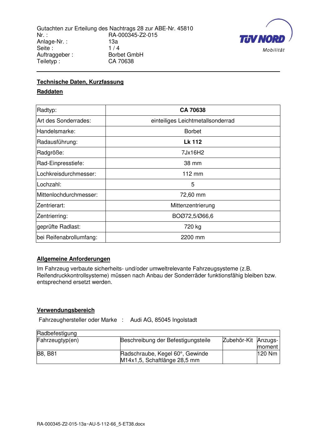 • Stimmt die KBA-Nummer auf der Felge mit diesem Dokument überein?