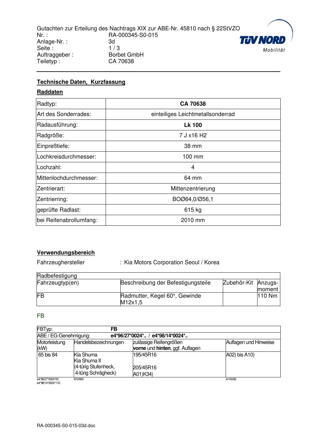 Dieses Gutachten (abe) bezieht sich auf die Alufelge Borbet CA 70638 in der Ausführung 7Jx16 ET 0, Mittenloch 0 mm (KBA 45810). Im PDF findest du typischerweise zulässige Reifengrößen, Auflagen/Anbauhinweise und – je nach Dokument – Hinweise zur Eintragung.